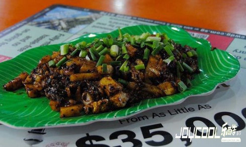 新加坡的萝卜糕上没有传统萝卜糕的奶油乳酪糖霜,它是由碎萝卜做成的,再加上炒鸡蛋、大蒜和各种香料,传统的酱汁有黑色的酸甜酱或者也可以不加酱。
