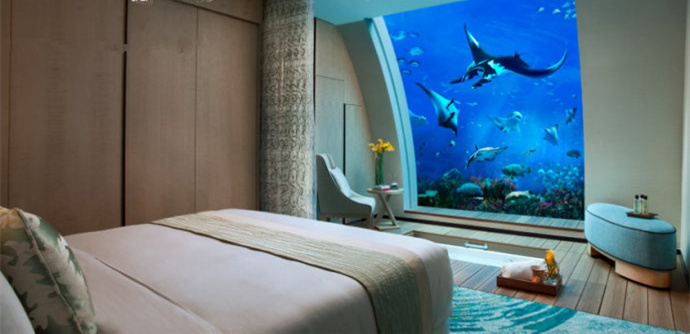 把房间和海水隔开的是一片厚30公分的亚克力塑料板,房间的落地窗贴上单向透视镜薄膜,客房内的住客可以看到海底世界,而潜水员或在水族缸另一面参观的游人则无法看到房内情况,隐私问题完全不用担心。“套房内灯光经过精心设计,窗帘拉开后灯光会自动调暗,设在落地窗两侧及天花板上的蓝色LED灯也会自动亮起,让室内与窗外的海底世界融为一体,营造出展现在我们眼前梦幻般的场景。”马克见我趴在窗前丝毫没有起来的意思,主动为我介绍说,“其实窗前这片区域也是有玄机的哦!”我一听,立刻来了兴趣。