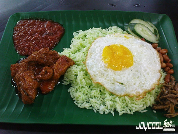 素菜更加重口味,用虾干和韭菜拌的豆芽脆嫩多汁,还有辣酱蒸茄子芋头杆芋头花、黄咖喱菠萝蜜瓤,叁巴酱炒臭豆、秋葵红咖喱浓汤、土豆饼,因为深受印度和中东的影响,每样菜都浓稠辛辣,充满香料和椰浆的味道。马来椰浆饭相比田野饭就简洁多了,用椰浆蒸煮的米饭,配上叁巴酱、黄瓜片、炸小凤尾鱼、炸花生和煎蛋,就是标准配置,包在芭蕉叶里,也是马来西亚的国早饭。因为简单,要求便高,先用浓椰浆浸过米以后再一起蒸熟,椰浆的油脂和香味都会渗透到每一粒米饭中,椰浆的新鲜度和纯度、米的品种都大有讲究,松软弹牙又得粒粒分明;炸的小鱼和花生必得酥脆爽口;画龙点睛的是叁巴酱,热辣鲜美的叁巴酱远不是辣酱那么简单,除了直接的热辣之外,更重要的是香味和口中的回味。叁巴酱用多种风干和新鲜的辣椒混合为原料,加入配料不同便个性不同,光是种类就有数十种。司徒驱车数里,专门到一个偏远的小吃中心,就为独一无二的叁巴酱。这家的叁巴酱每天热辣新鲜,充满了红葱、海鲜的气息,还有淡淡的甜味。学司徒的样子将鸡蛋捣碎,花生、小鱼,拌了叁巴酱在米饭里,一口混合吃下去,又香又开怀。推荐去处:Sinar Pagi Nasi Padang 田野饭